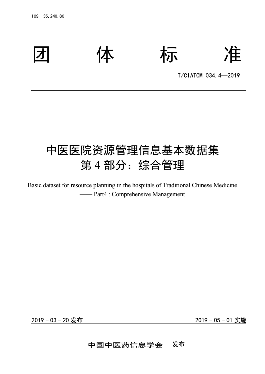 中文名称:中医医院资源管理信息基本数据集 第4部分:综合管理