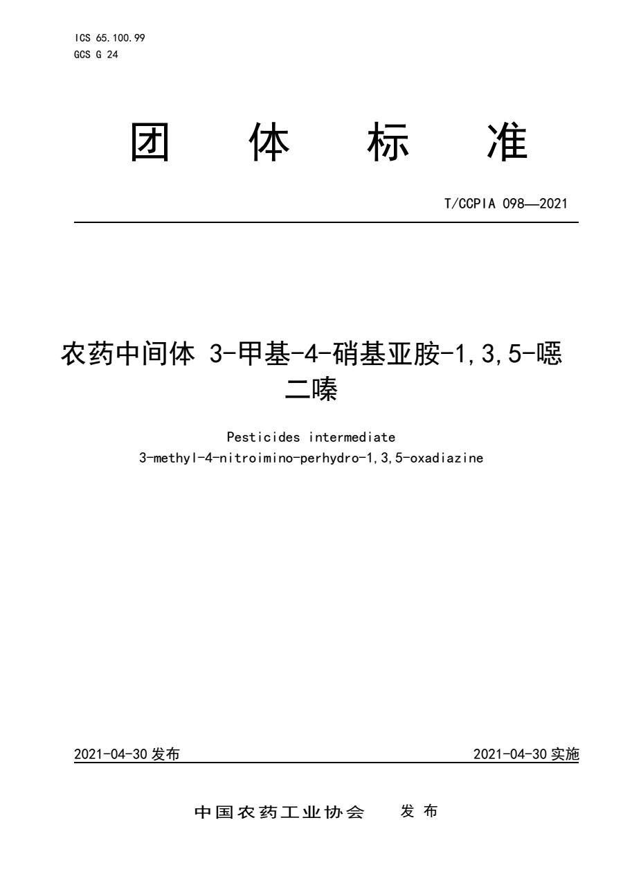 T/CCPIA 098-2021 农药中间体 3-甲基-4-硝基亚胺-1,3,5-噁二嗪