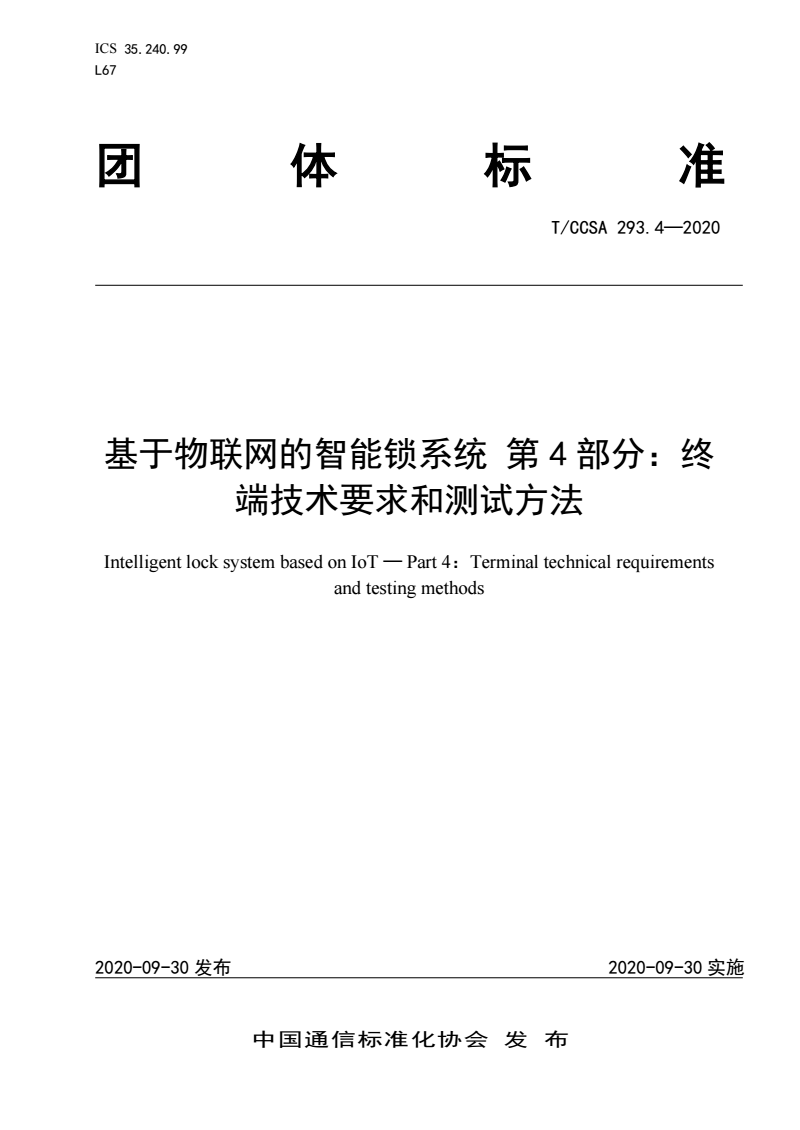 T/CCSA 293.4-2020 基于物联网的智能锁系统 第4部分:终端技术要求和测试方法