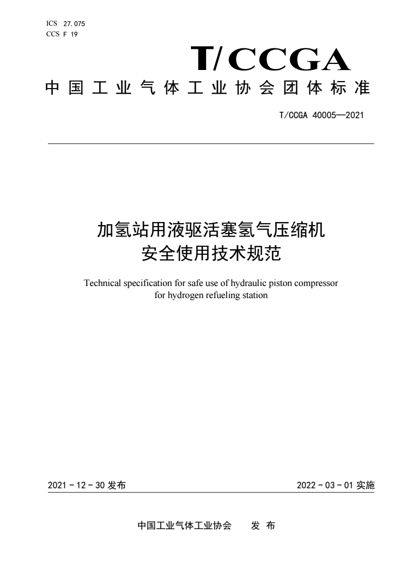 T/CCGA 40005-2021 加氢站用液驱活塞氢气压缩机安全使用技术规范
