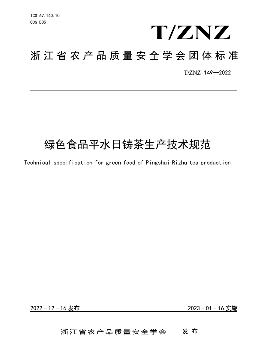 英文名称:Technical specification for green food of Pingshui Rizhu tea production