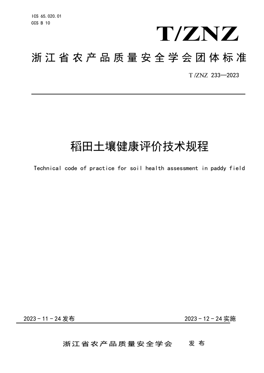 英文名称:Technical code of practice for soil health assessment in paddy field