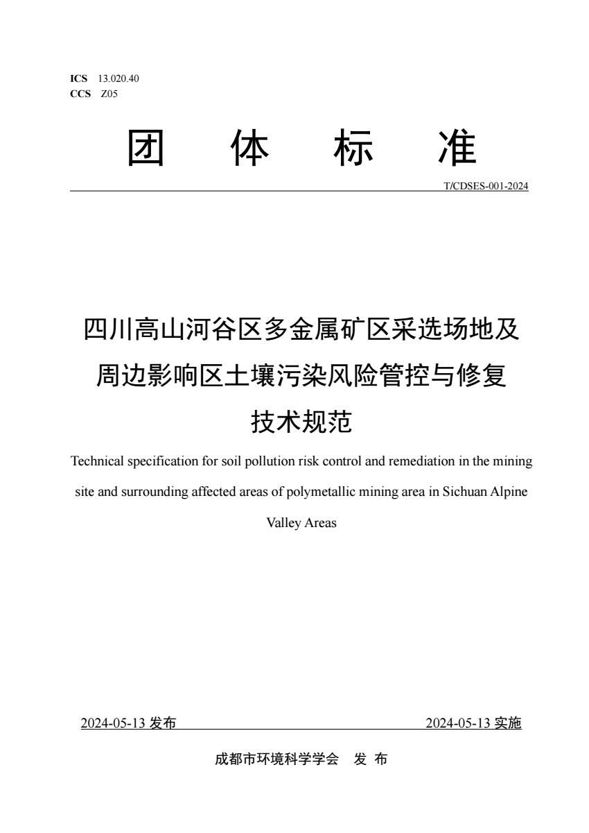 中文名称:四川高山河谷区多金属矿区采选场地及周边影响区土壤污染风险管控与修复技术规范