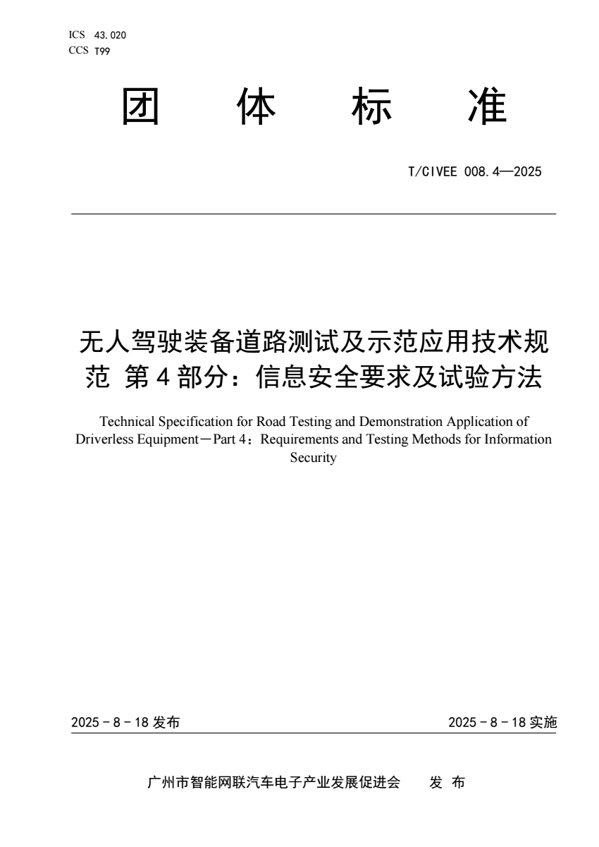 中文名称:无人驾驶装备道路测试及示范应用技术规范 第4部分:信息安全要求及试验方法