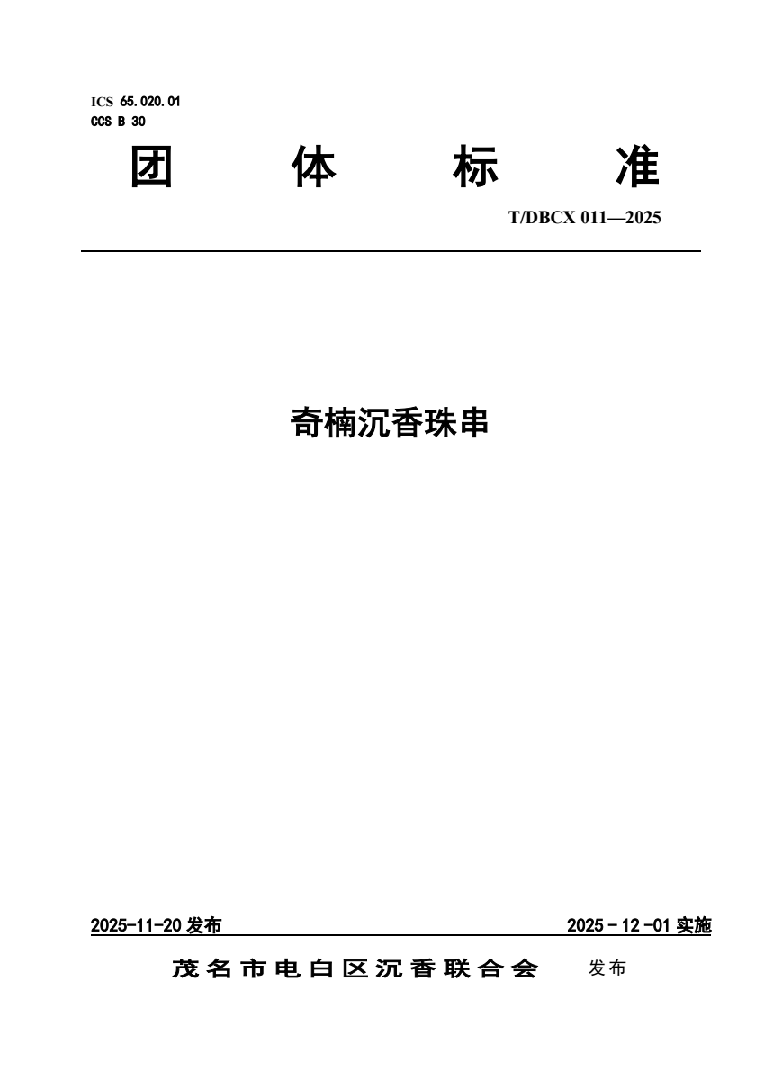 内容简介:本文件界定了奇楠沉香的术语和定义,规定了产品分类、要求、检验规则等要求,描述了相应的试验方法。本文件适用于利用人工种植的白木香(Aquilaria sinensis(Lour.)Spreng.)易结香品种形成的奇楠沉香加工成的珠串的质量控制和检验。