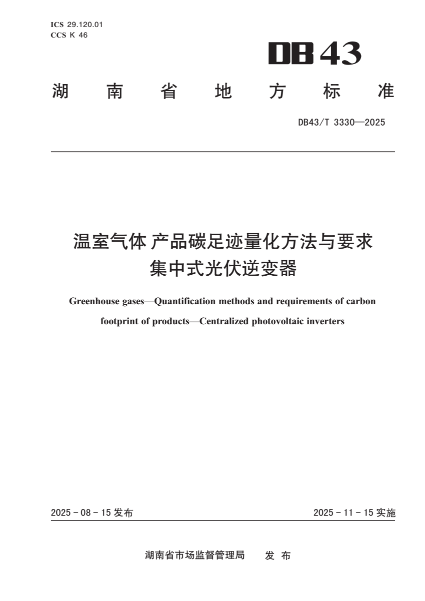 DB43/T 3330-2025 温室气体 产品碳足迹量化方法与要求 集中式光伏逆变器