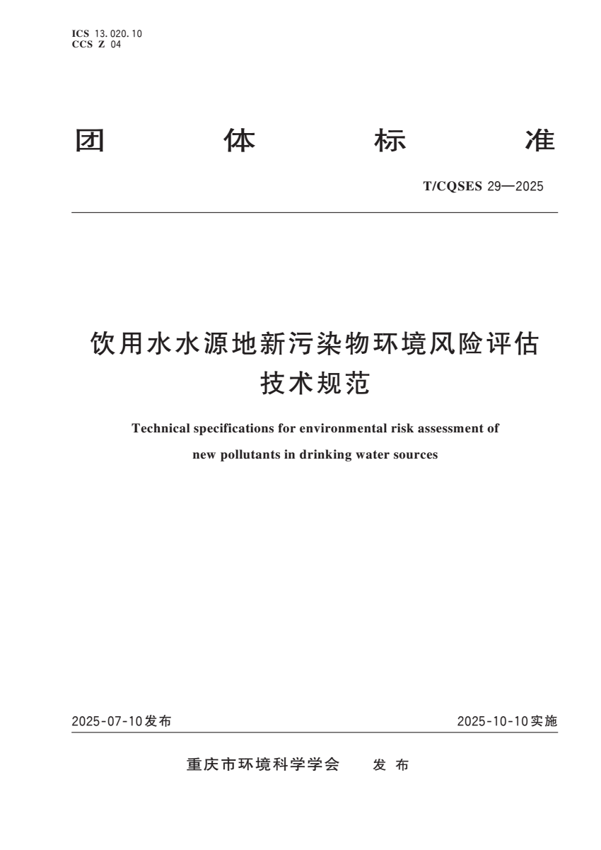 T_CQSES 29-2025 饮用水水源地新污染物环境风险评估技术规范.pdf