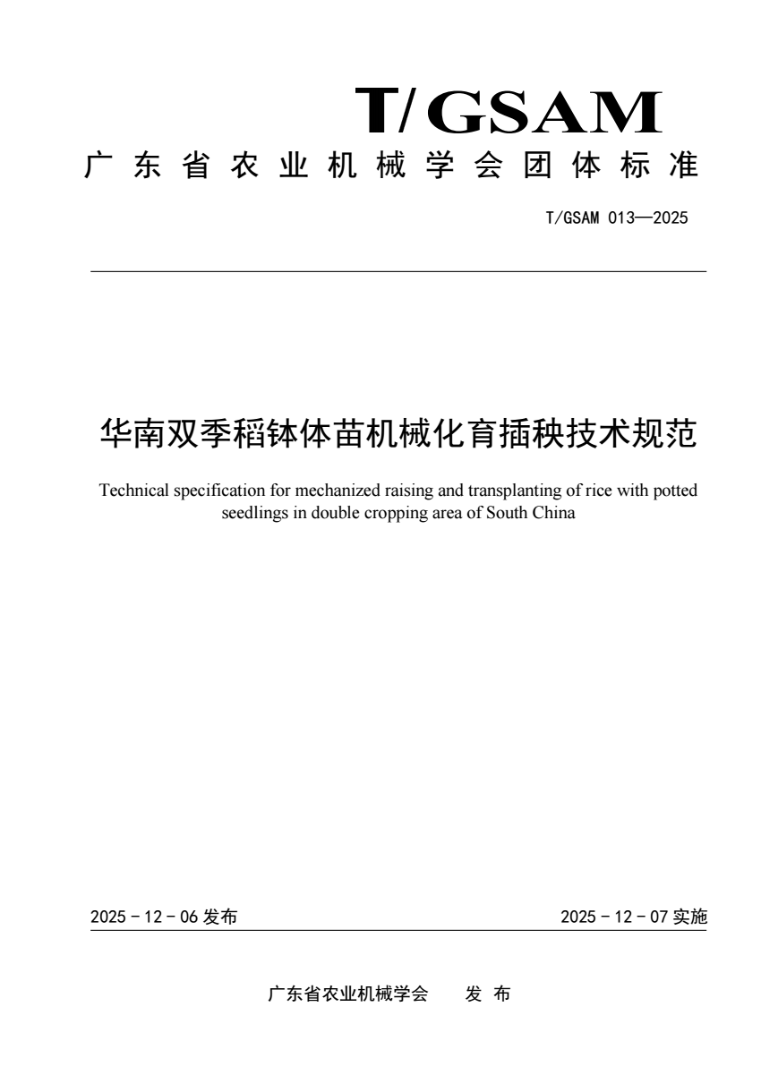 T_GSAM 013-2025 华南双季稻钵体苗机械化育插秧技术规范.pdf (680.49 KB)