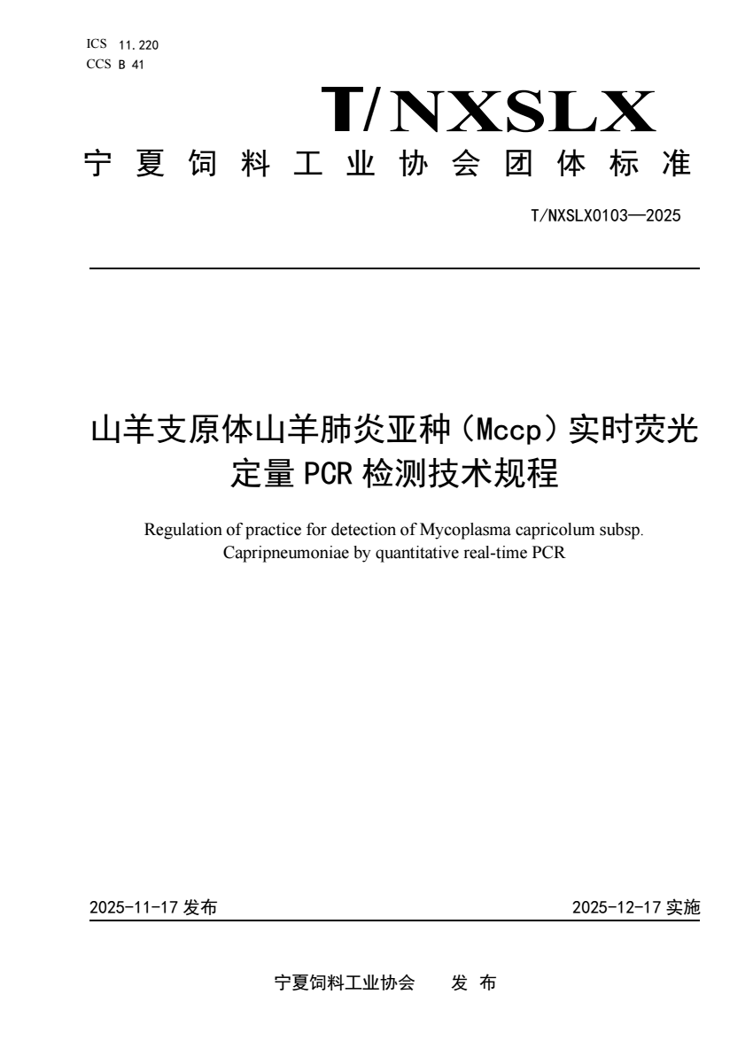 中文名称:山羊支原体山羊肺炎亚种(Mccp)实时荧光 定量 PCR 检测技术规程