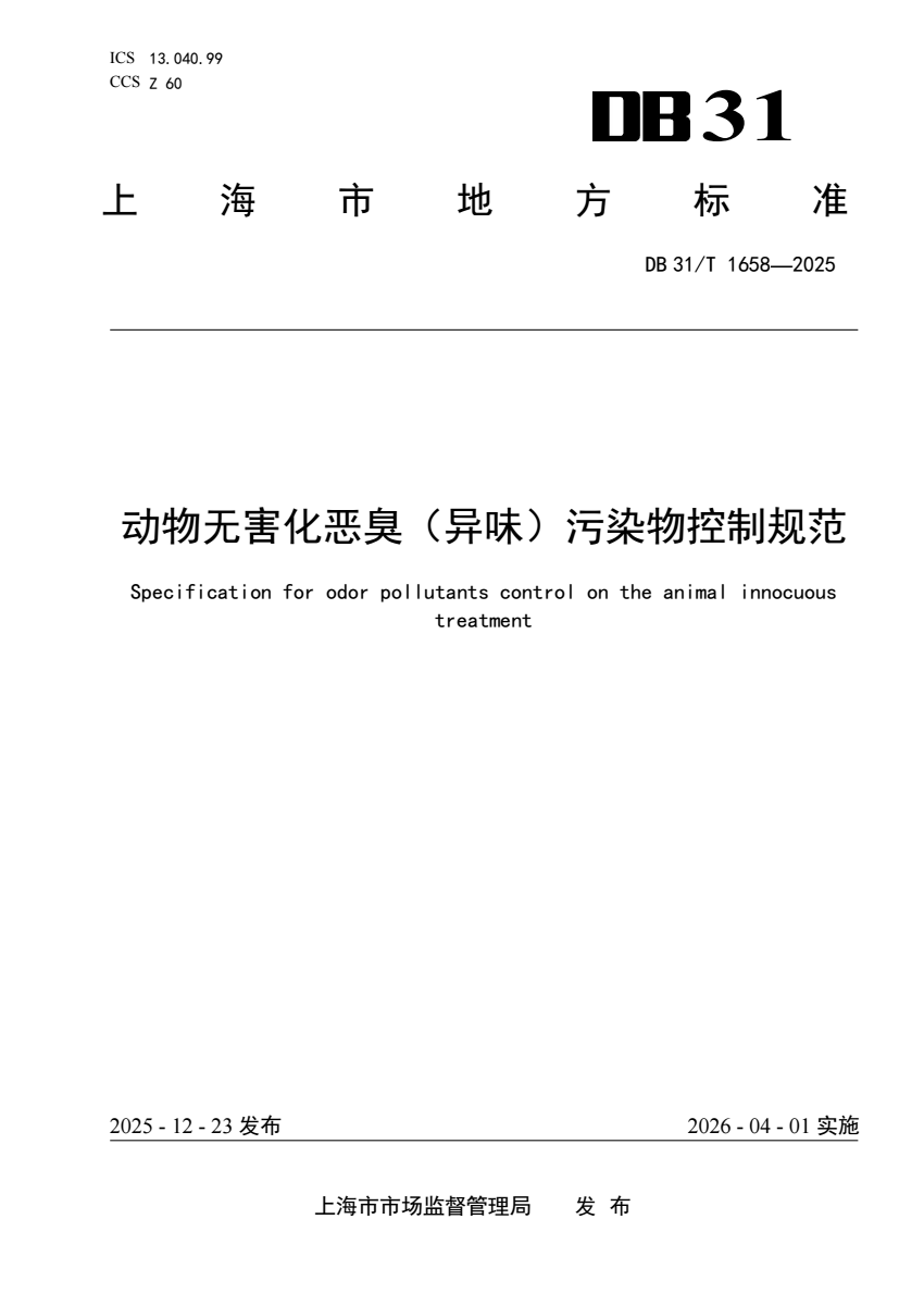 内容简介:本文件规定了动物无害化恶臭(异味)污染物控制的总体要求、排放控制、排放限值和监测要求。本文件适用于上海市动物无害化收集场所、转运过程及处理场所的恶臭(异味)污染物排放控制。