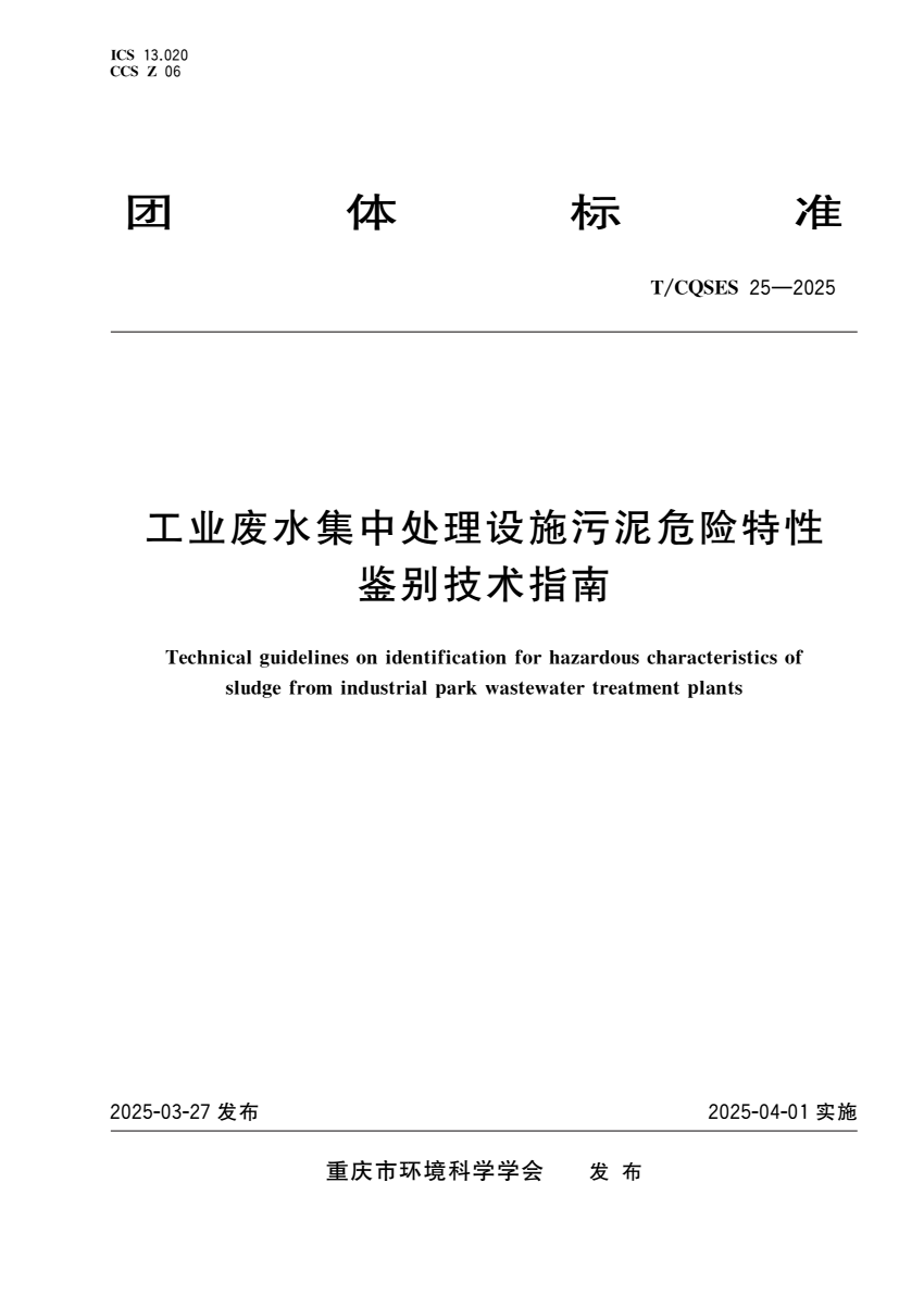 T_CQSES 25-2025 工业废水集中处理设施污泥危险特性鉴别技术.pdf