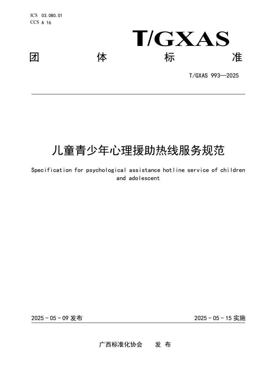 英文名称:Specification for psychological assistance hotline service of children and adolescent