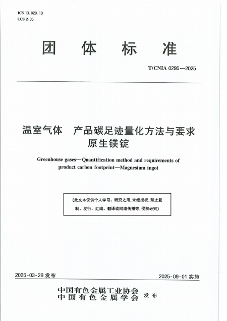T/CNIA 0295-2025 温室气体 产品碳足迹量化方法与要求 原生镁锭