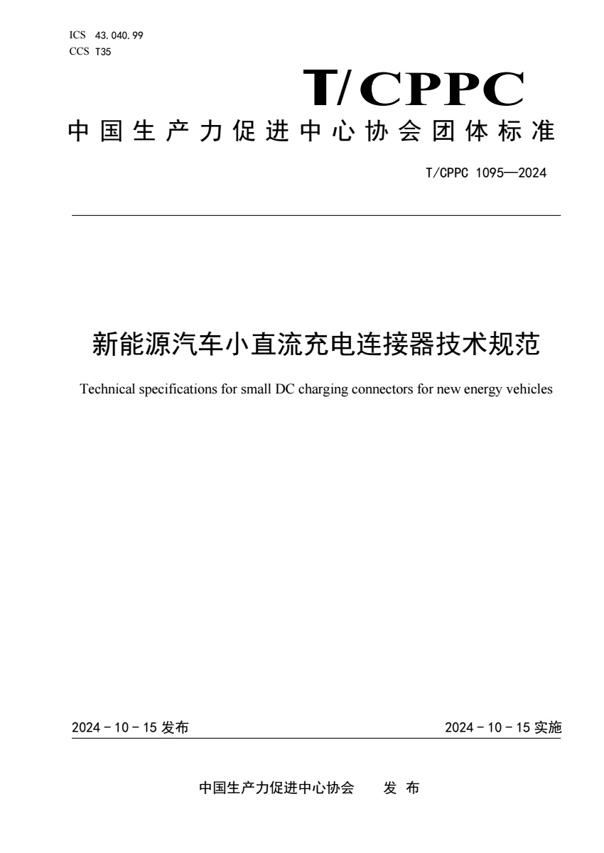 英文名称:Technical specifications for small DC charging connectors for new energy vehicles