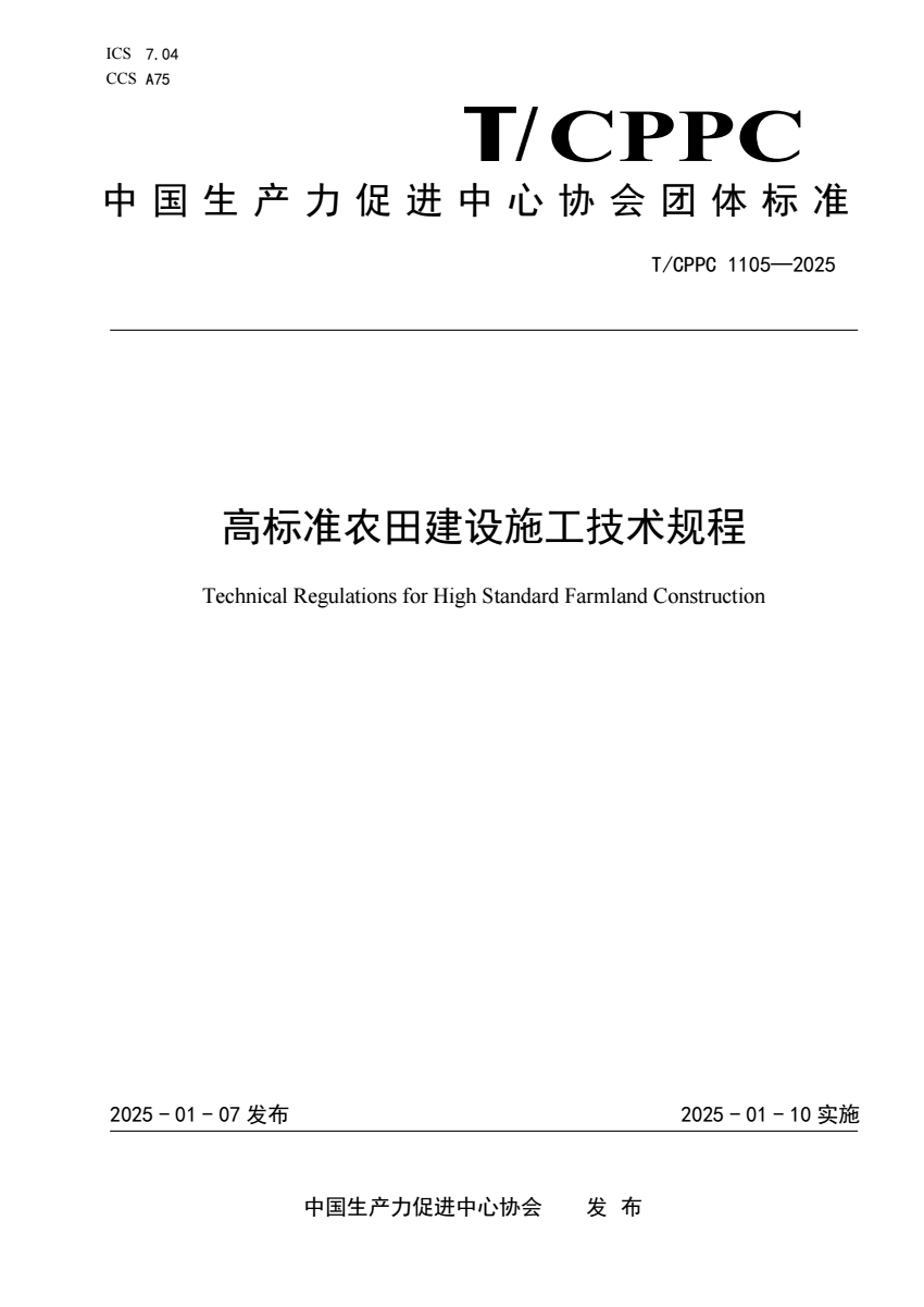 内容简介:本文件规定了高标准农田建设内容与施工技术要求、信息化建设与档案管理等标准化、规范化的有关规定。本文件适用于全国高标准农田建设项目施工技术控制活动。 T_CPPC 1105-2025 高标准农田建设施工技术规程.pdf(1.38 MB)