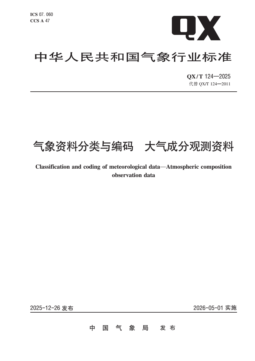 QX_T 124-2025 气象资料分类与编码 大气成分观测资料.pdf (988.83 KB)