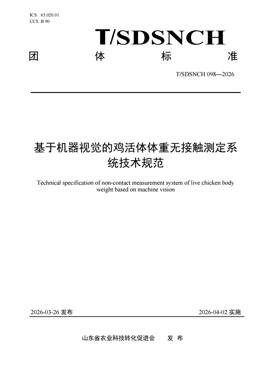 中文名称:基于机器视觉的鸡活体体重无接触测定系统技术规范