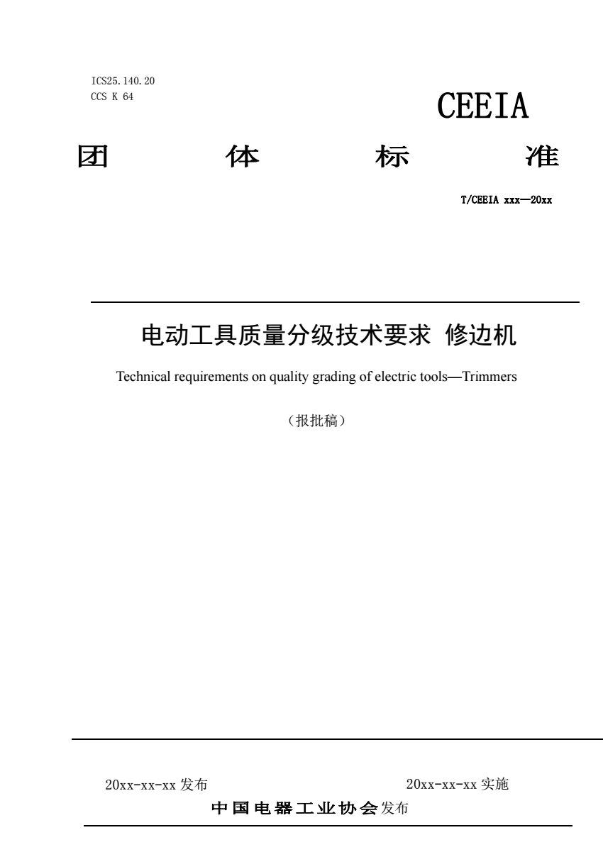 英文名称:Technical requirements on quality grading of electric tools—Trimmers