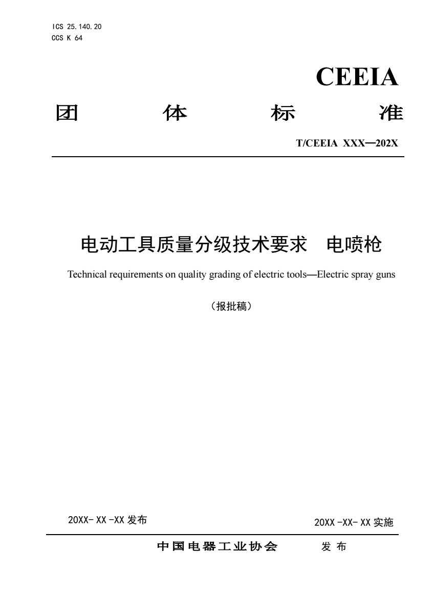 英文名称:Technical requirements on quality grading of electric tools—Electric spray guns