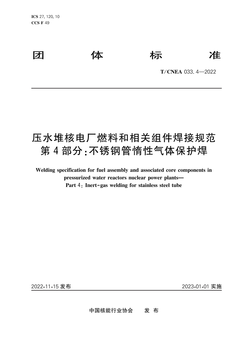 中文名称:压水堆核电厂燃料和相关组件焊接规范 第4部分:不锈钢管惰性气体保护焊
