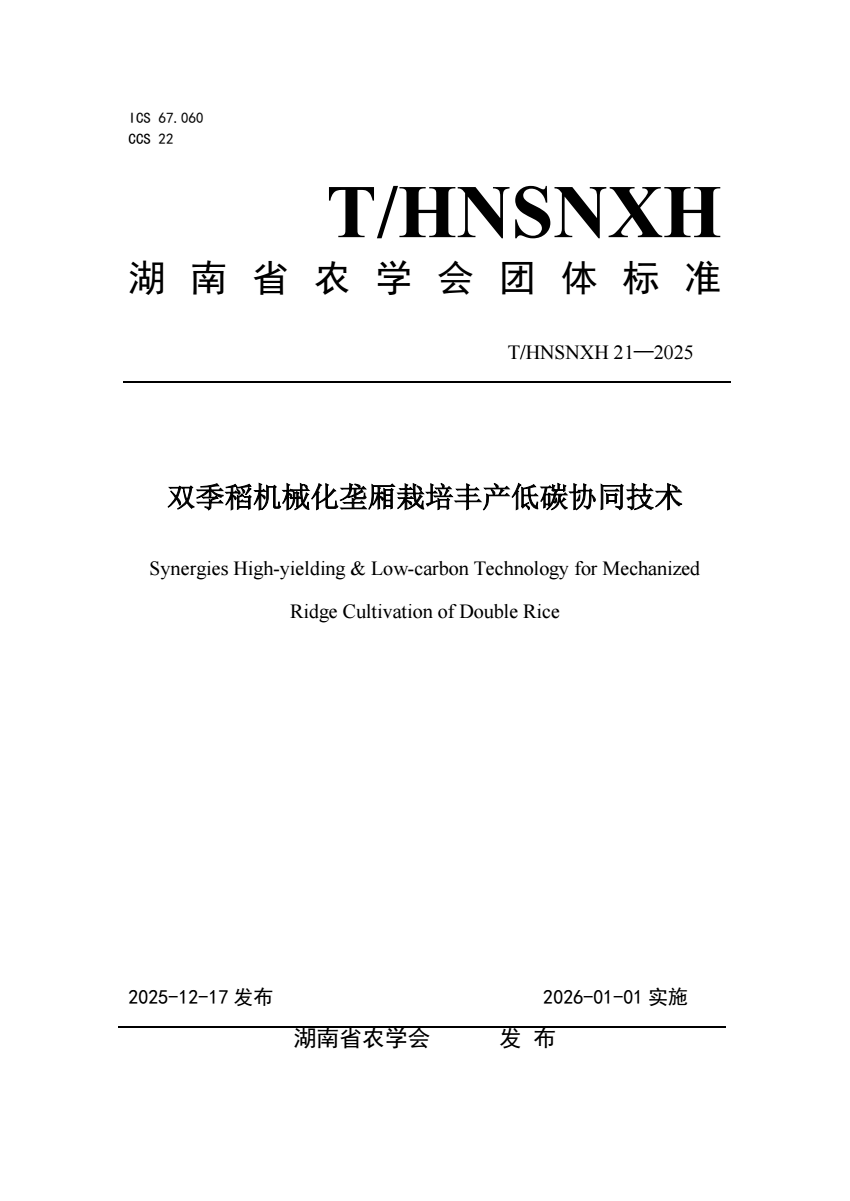 T_HNSNXH 21-2025 双季稻机械化垄厢栽培丰产低碳协同技术.pdf