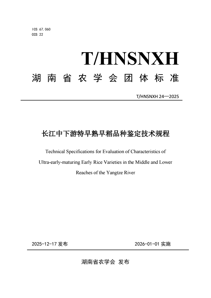 英文名称:Technical Specifications for Evaluation of Characteristics of Ultra-early-maturing Early Rice Varieties in the Middle and Lower Reaches of the Yangtze River