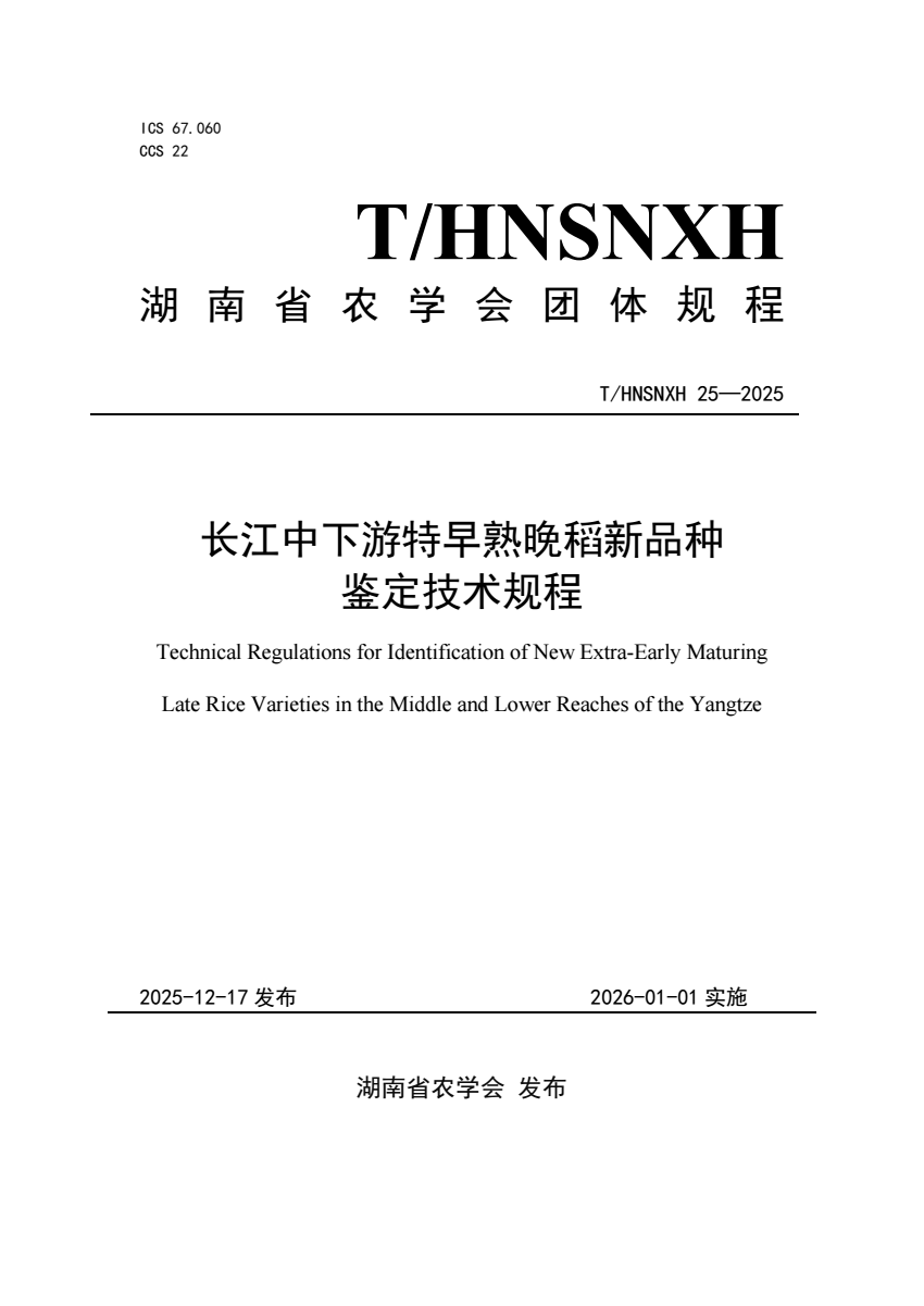 英文名称:Technical Regulations for Identification of New Extra-Early Maturing Late Rice Varieties in the Middle and Lower Reaches of the Yangtze