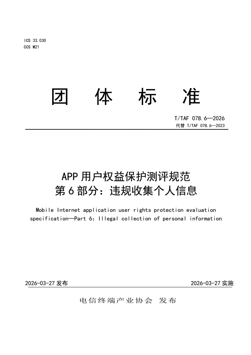 内容简介:本文件规定了移动应用软件及第三方软件开发工具包违规收集个人信息部分的检测细则以及典型检测场景。本文件适用于移动应用软件提供者规范用户收集使用个人信息处理活动,也适用于主管部门、第三方评估机构等组织对移动应用软件收集使用个人信息行为进行监督、管理和评估。 T_TAF 078.6-2026 APP用户权益保护测评规范 第6部分:.pdf(263 KB)
