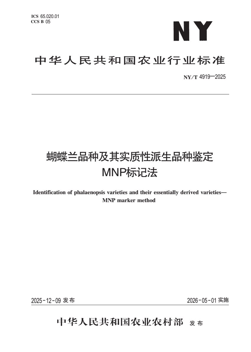 NY_T 4919-2025 蝴蝶兰品种及其实质性派生品种鉴定 MNP标.pdf (2.65 MB)