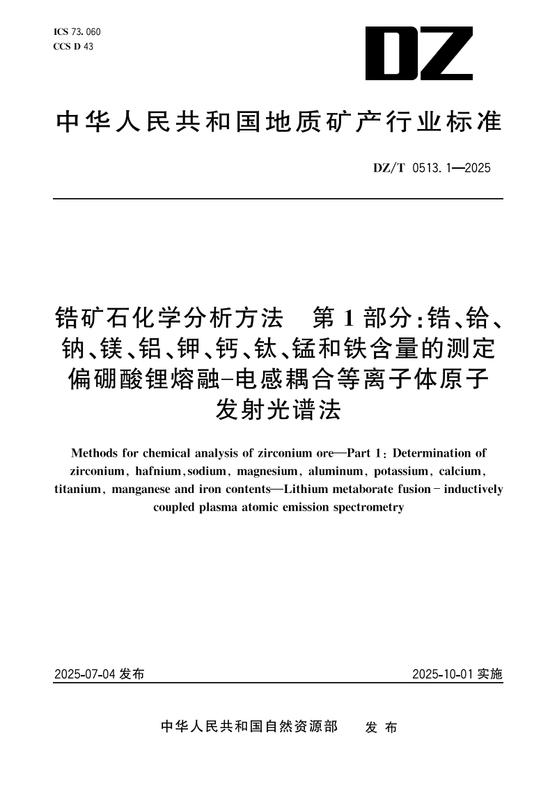 DZ/T 0513.1-2025 锆矿石化学分析方法?第1部分:锆、铪、钠、镁、铝、钾、钙、钛、锰和铁含量的测定 偏硼酸锂熔融-电感耦合等离子体原子发射光谱法