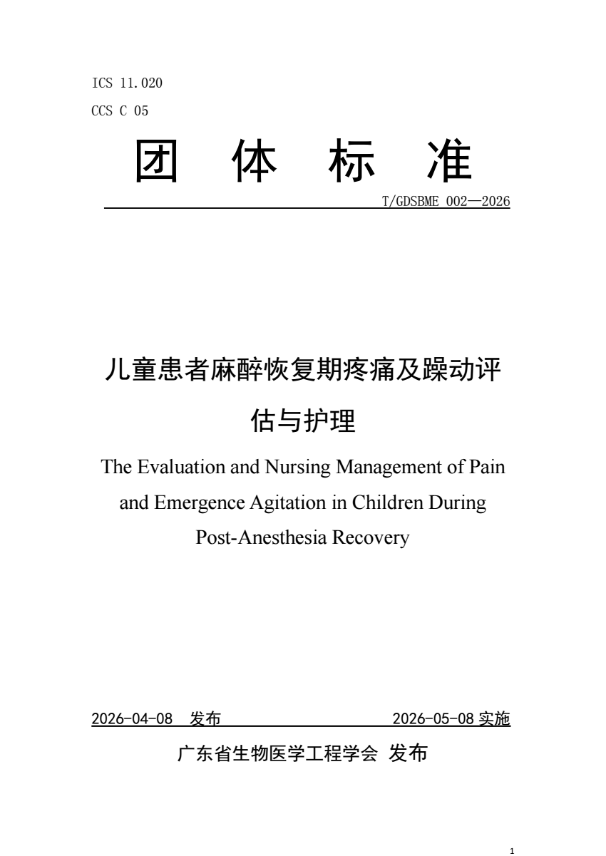 T_GDSBME 002-2026 儿童患者麻醉恢复期疼痛及躁动评估与护.pdf