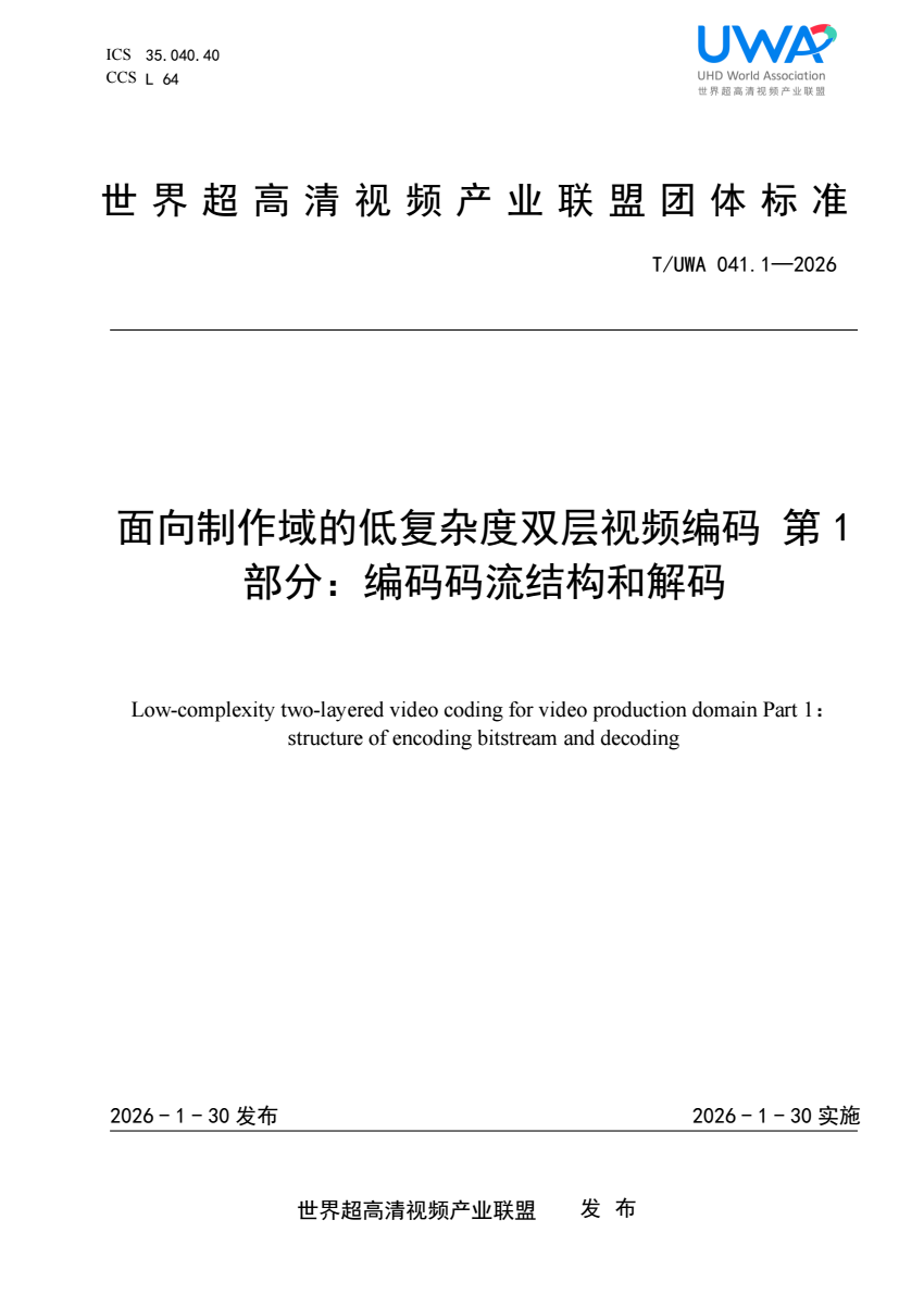 T_UWA 041.1-2026 面向制作域的低复杂度双层视频编码 第1.pdf