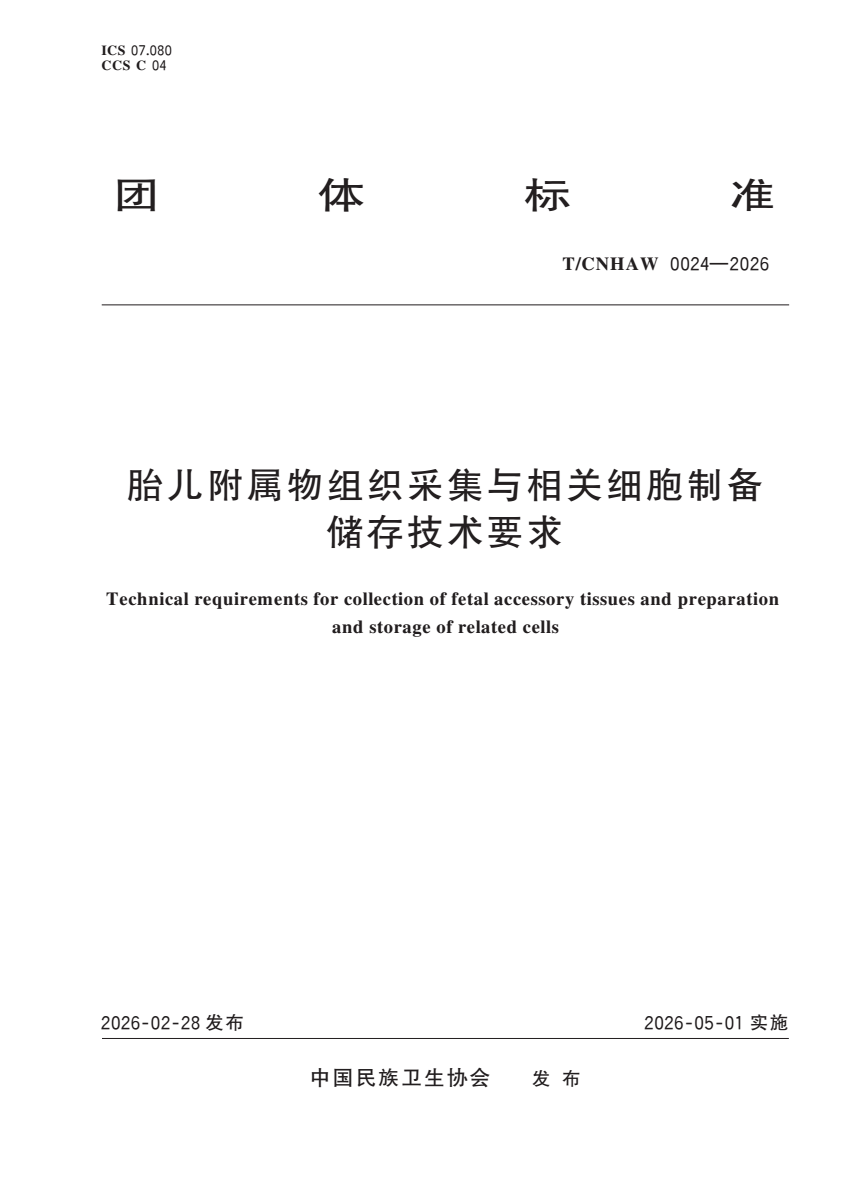 T_CNHAW 0024-2026 胎儿附属物组织采集与相关细胞制备储存.pdf